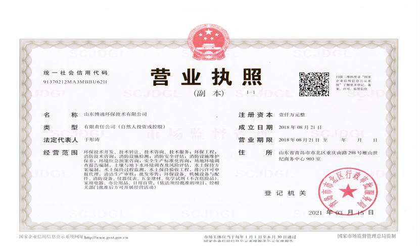山東博通環(huán)保技術有限公司是一家專業(yè)從事環(huán)保、安全、消防的多元化技術服務公司,公司致力于打造專業(yè)的技術服務團隊,立足青島,輻射山東,服務范圍涵蓋:環(huán)保技術開發(fā)、技術轉讓、技術咨詢、技術服務;環(huán)保工程;消防技術咨詢;消防設施檢測;消防安全評估;消防設施維護保養(yǎng);環(huán)境應急預案咨詢;安全生產(chǎn)標準化咨詢;場地環(huán)境調(diào)查報告編制,土壤與地下水環(huán)境調(diào)查及風險評估,水土保持方案編制,水土保持過程監(jiān)測,水土保持驗收工程,排污許可申報代理,清潔生產(chǎn)審核;...